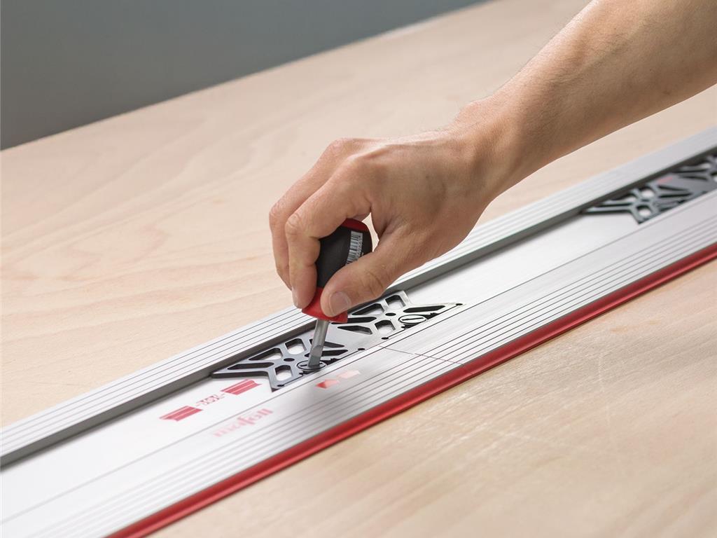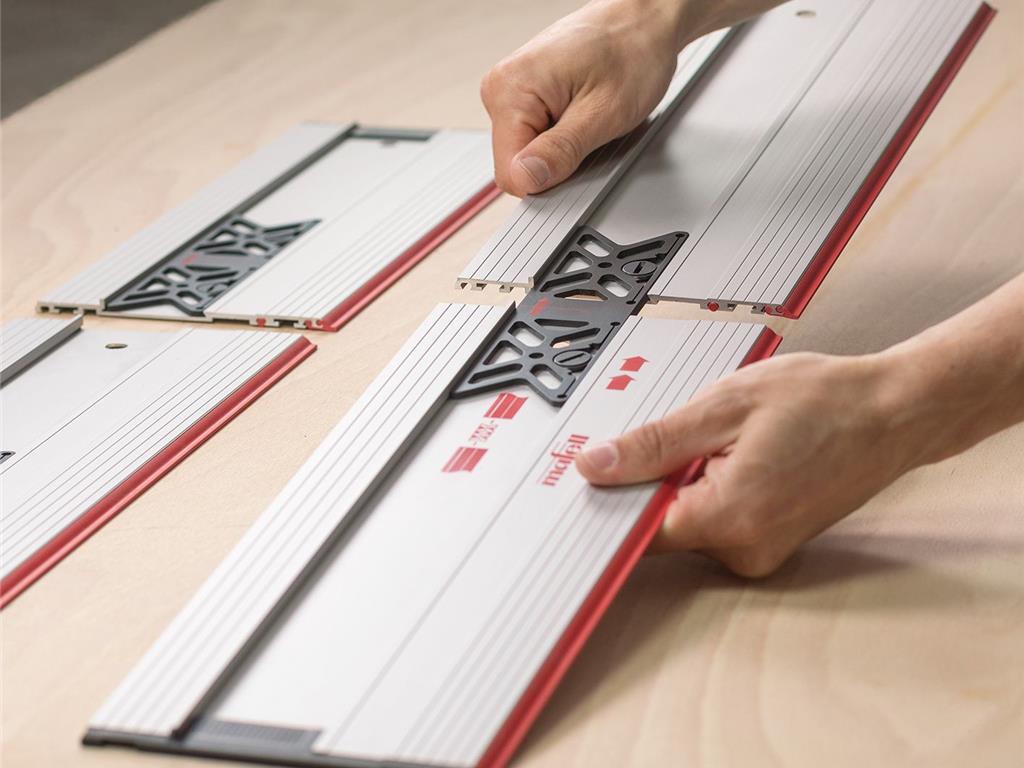 Gumijasti rob je kontaktni rob in zaščita pred trganjem v enem. Za optimalne rezultate dela se na vašo žago zareže pred prvim rezom. Anodizirana drsna prevleka na vrhu tirnice omogoča udobno rokovanje in zmanjšuje potisni upor ročne krožne žage. Konec profila, ki je vključen v obsegu dobave, preprečuje, da bi se kabel in sesalna cev zataknila na začetku tirnice. Širina tirnice je bila izbrana tako, da med rezanjem nanjo drsi celotna osnovna plošča stroja.